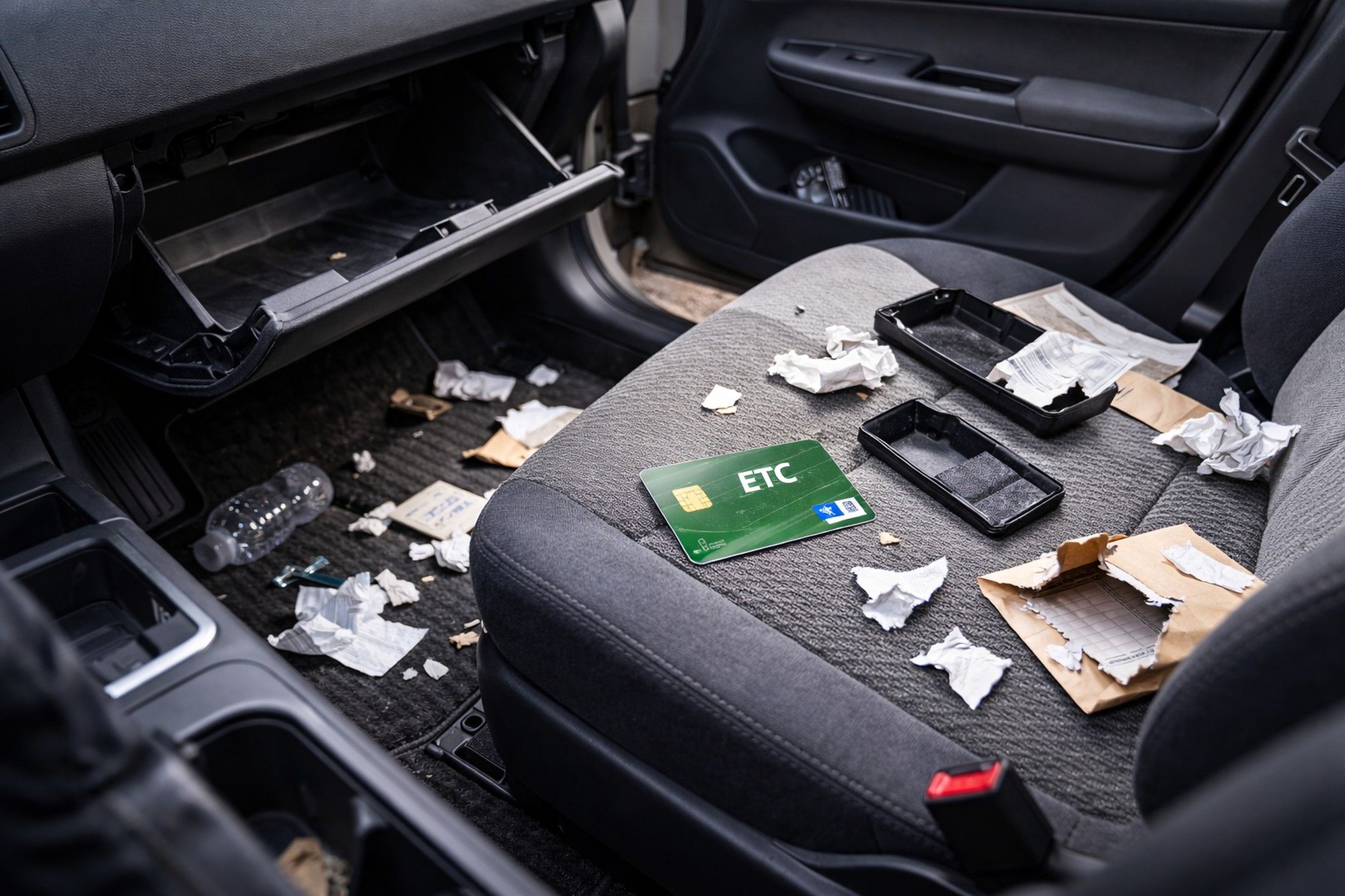 帰宅して駐車場に停め、エンジンを切って荷物を持って家に入ります。ETCカードは挿したままでも特に困らないので、そのままになります。ところが翌朝、車内の小物入れが荒らされていることに気づきます。財布や小物と一緒に、挿しっぱなしのETCカードも見当たりません。