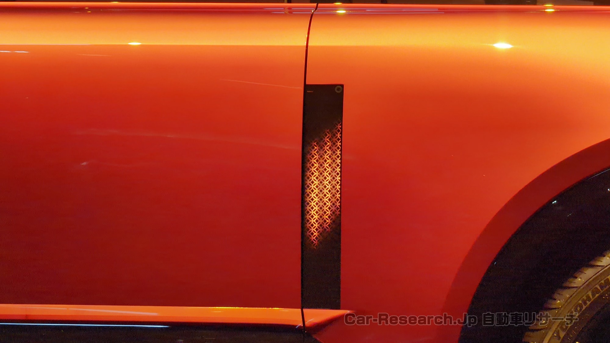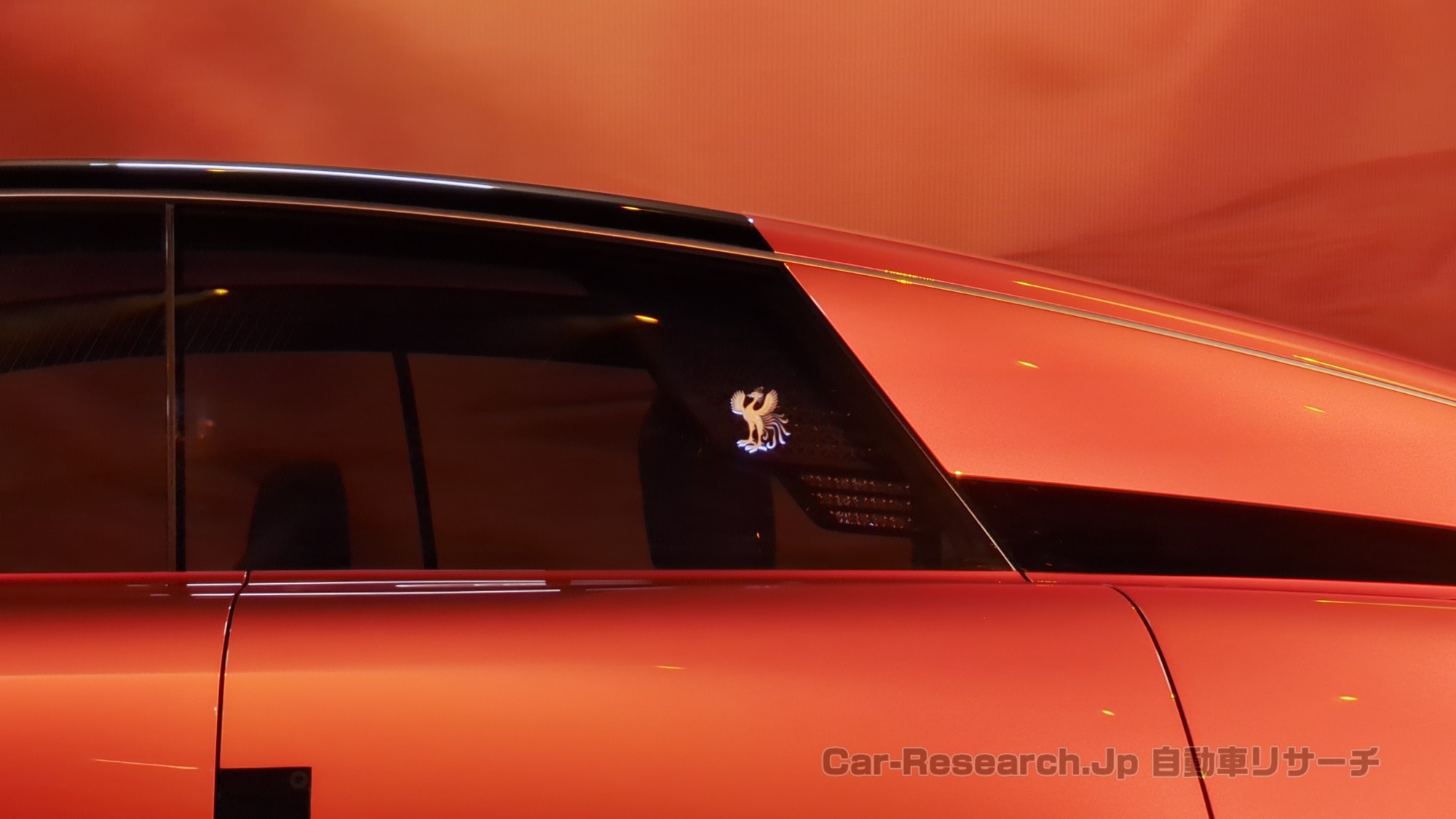 フロントは組子細工を想起させる意匠のグリルを据え、中央に鳳凰(ホウオウ)エンブレムを掲出。4眼LEDのライティングシグネチャーは、夜間の存在感を主張しながらも過度な攻撃性を避け、静けさと品位を外観から語ります。