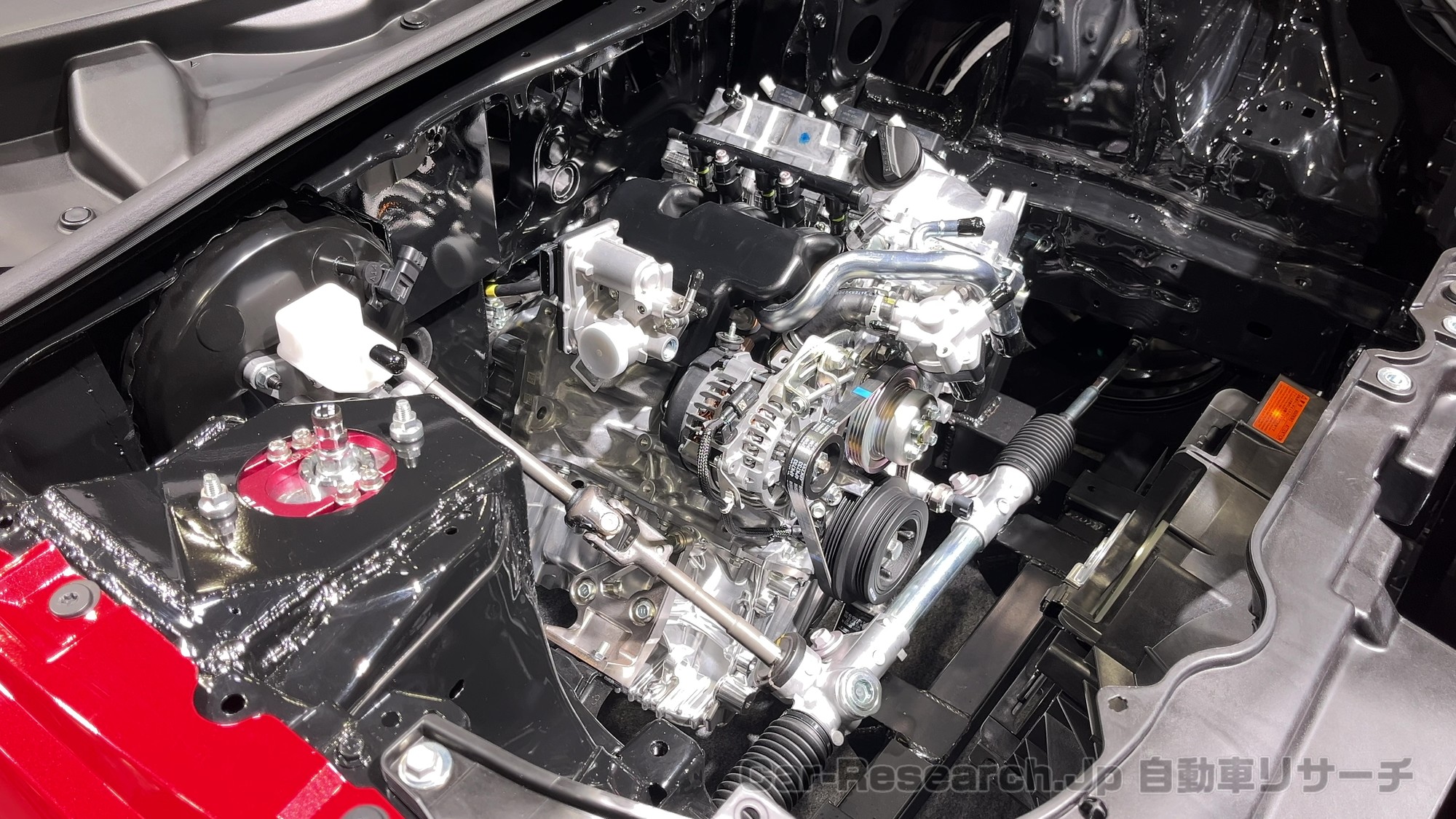 縦置きというのは、クルマの進む向きに対してエンジンのクランク軸が前後に向く置き方で、FRに適したレイアウトです。ここでは軽商用車のハイゼット系に使われる直列3気筒ターボのユニットが採用され、低い位置に収まるよう工夫されていました。