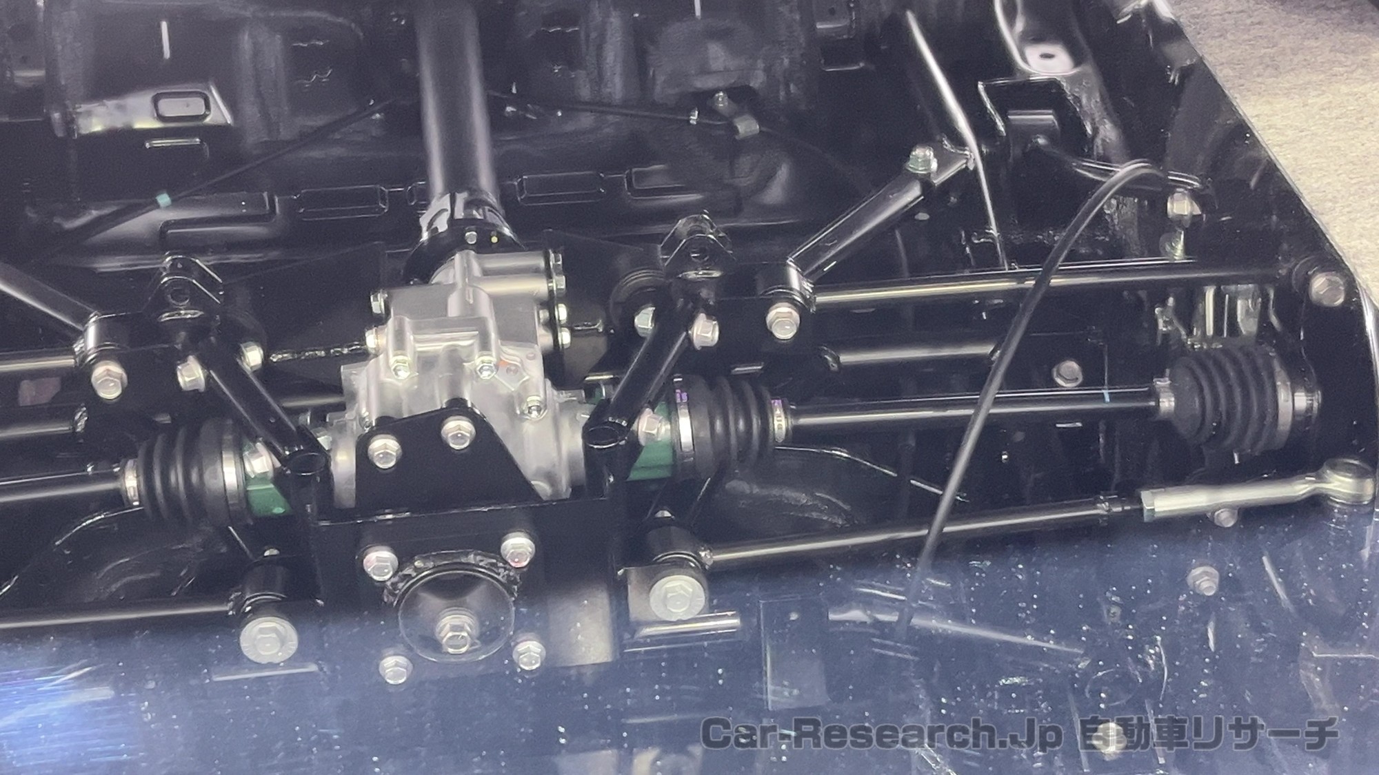 展示ではボンネットフードとトランクフードが外され、内部が見える状態で置かれていました。結果として、エンジン周辺だけでなく、リヤサスペンションの取り付け部まで視線が通り、レイアウトの意図を隠さずに見せる演出になっています。