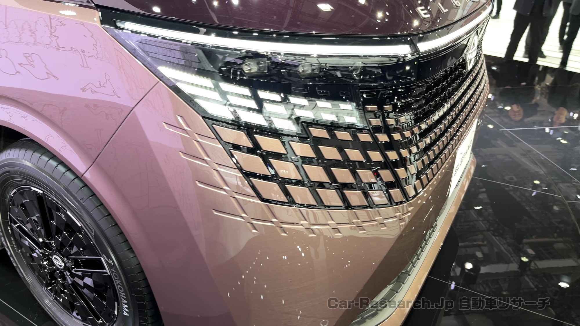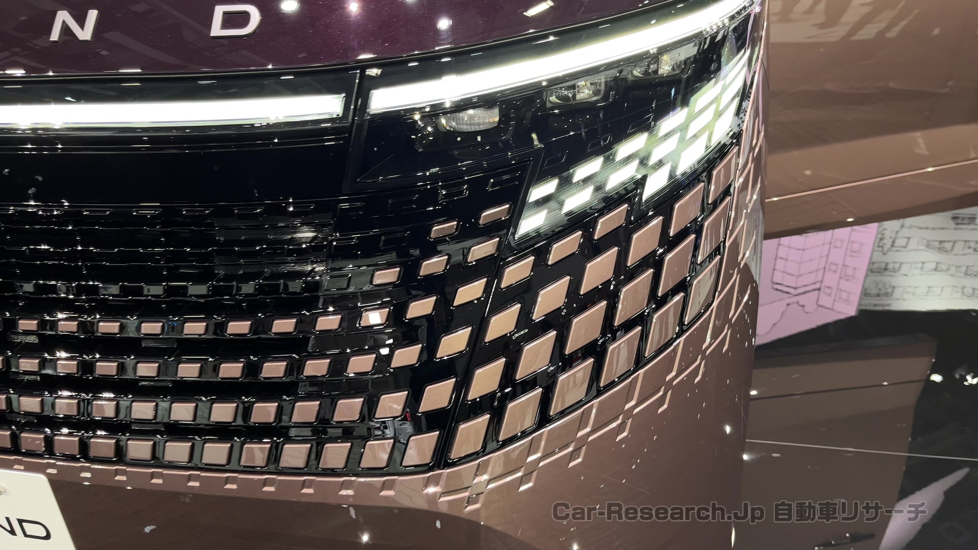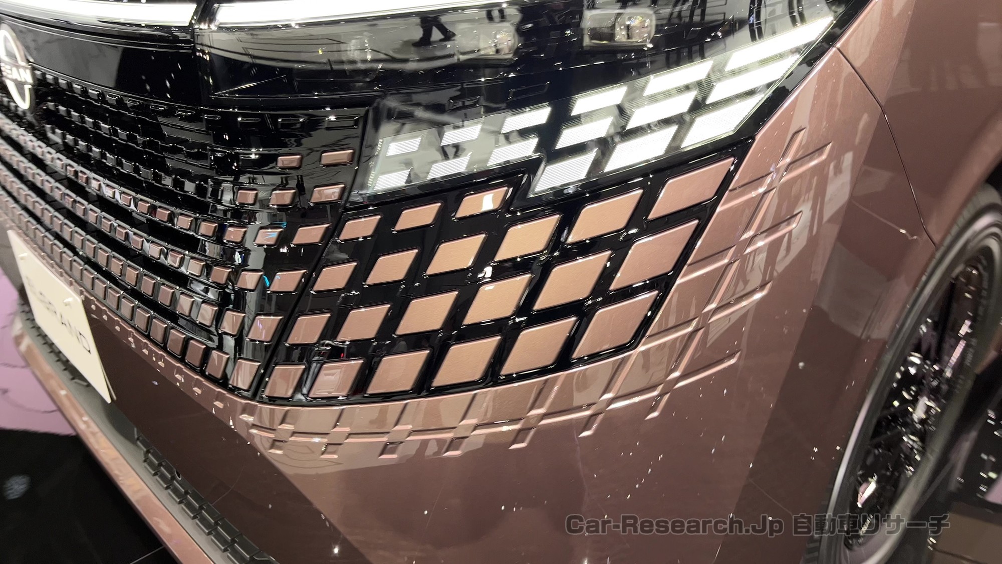 新型エルグランドのエクステリアは、フロントではドット柄をベールにしたたくましさと、LEDランプ類の繊細さを両立させているのが特徴です。