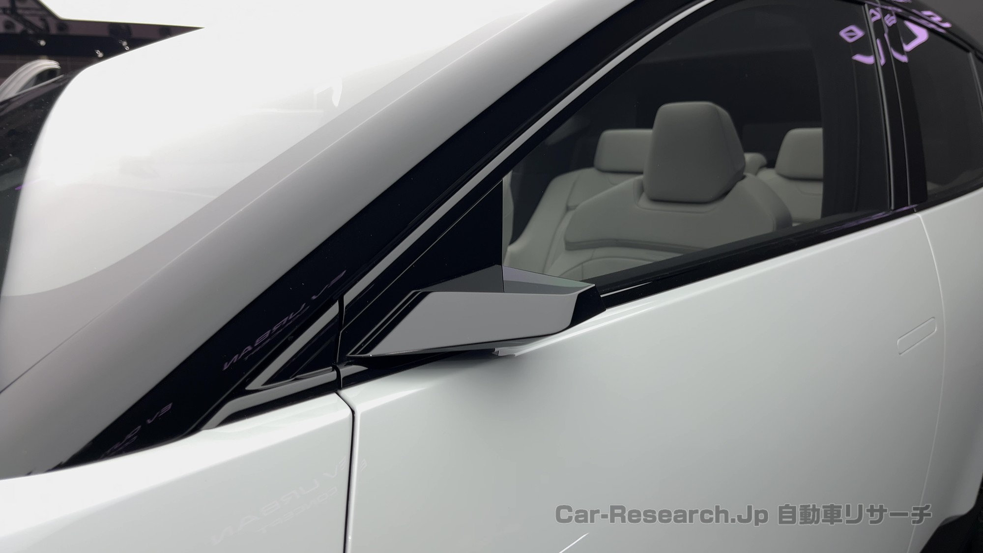 展示個体は、ドアミラー部に相当する位置にカメラユニットを備え、車内側で映像化するサイドカメラミラーシステムを装備していました。