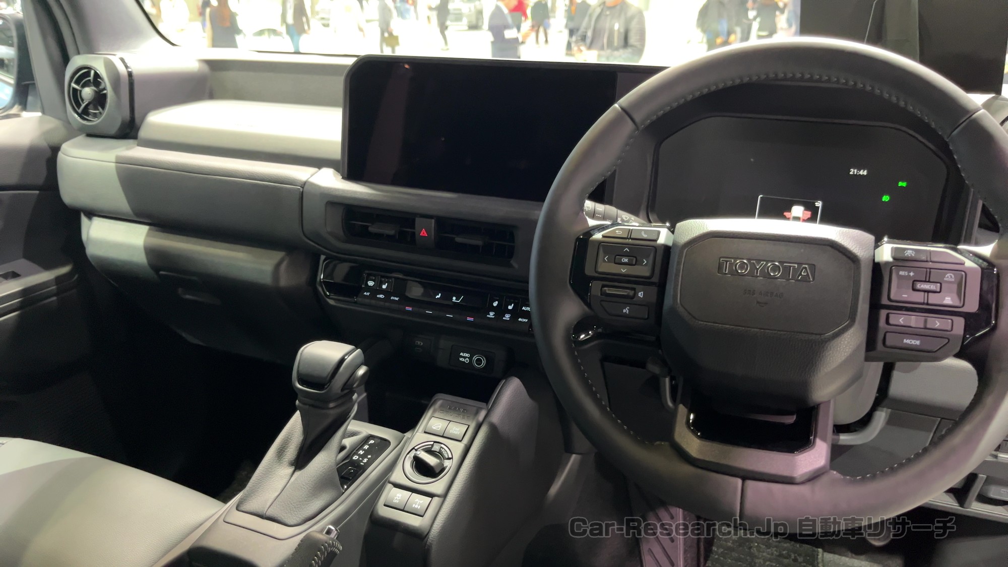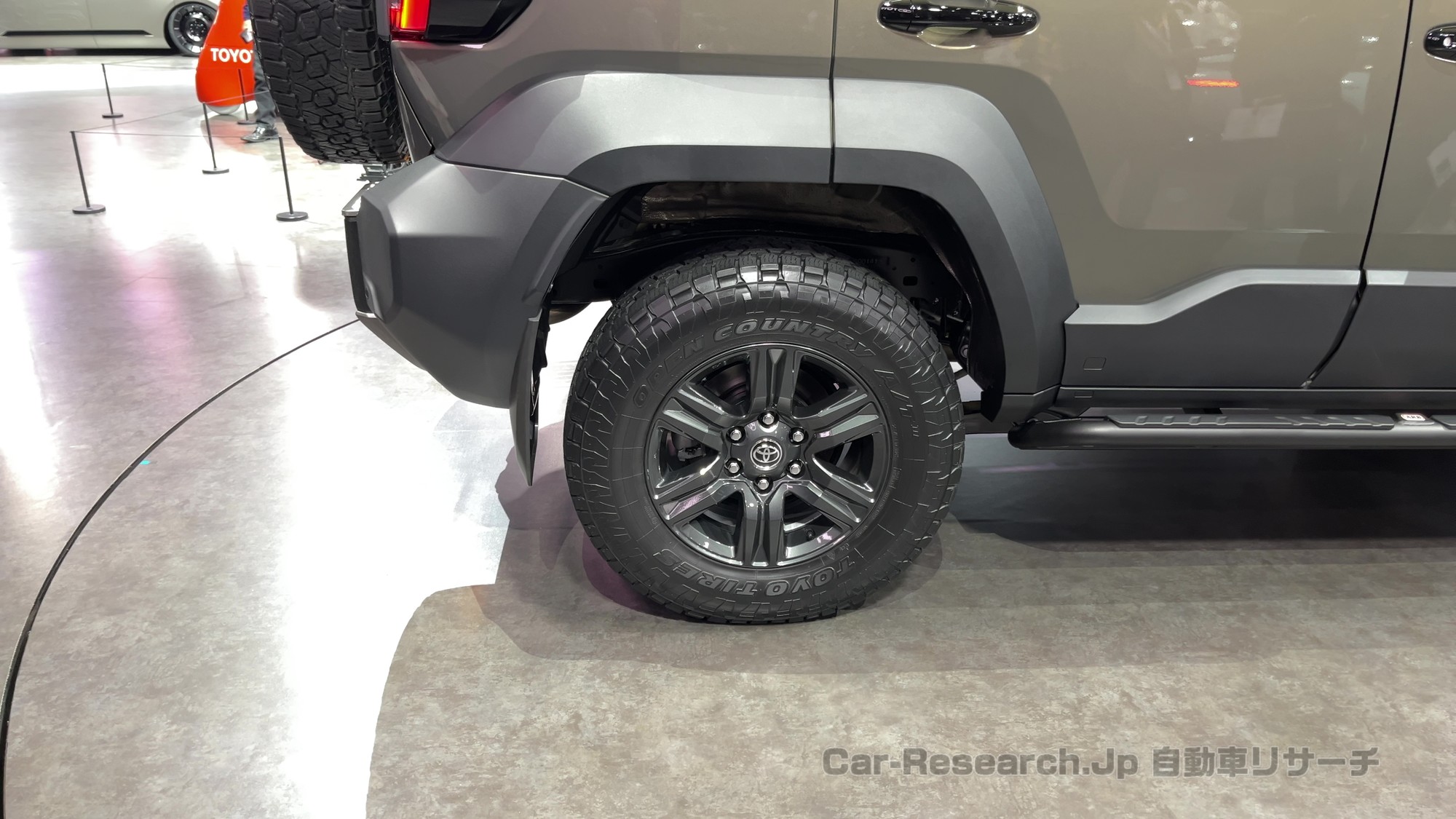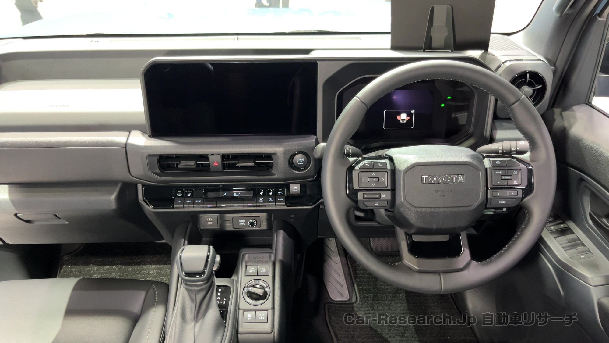 会場でランドクルーザーFJの実車をじっくり眺めた第一印象は「外観の迫力が強い」、そして「シリーズにふさわしい上質感がきちんとある」、対照的に「ボディサイズのわりに室内はやや窮屈」という3点でした。