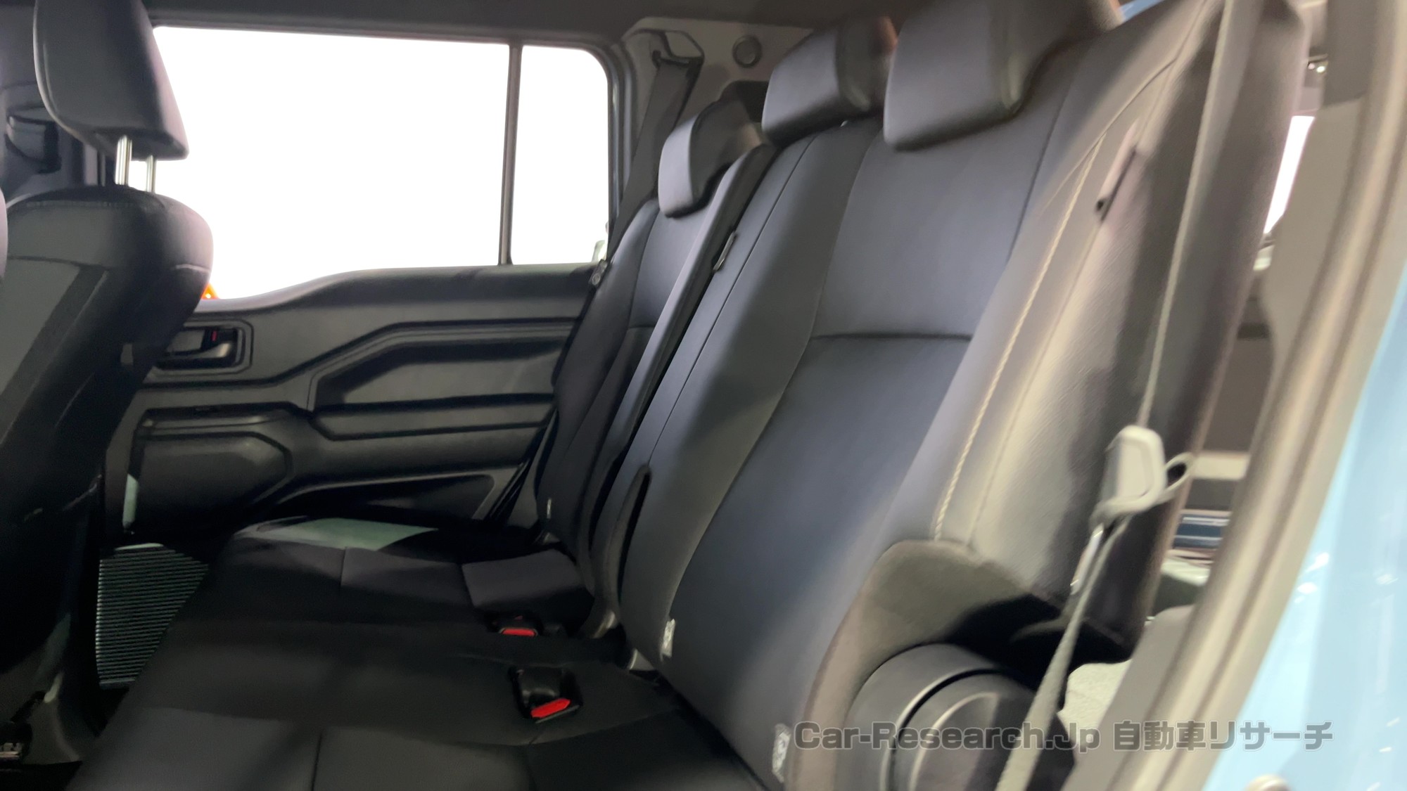 最小回転半径5.5mという数値どおり、外から見てもタイヤの切れ角や前後のオーバーハングが短く、狭い場所での扱いやすさが想像しやすい一方、実際に2列目へ乗り込むとタイトさが目立ちます。