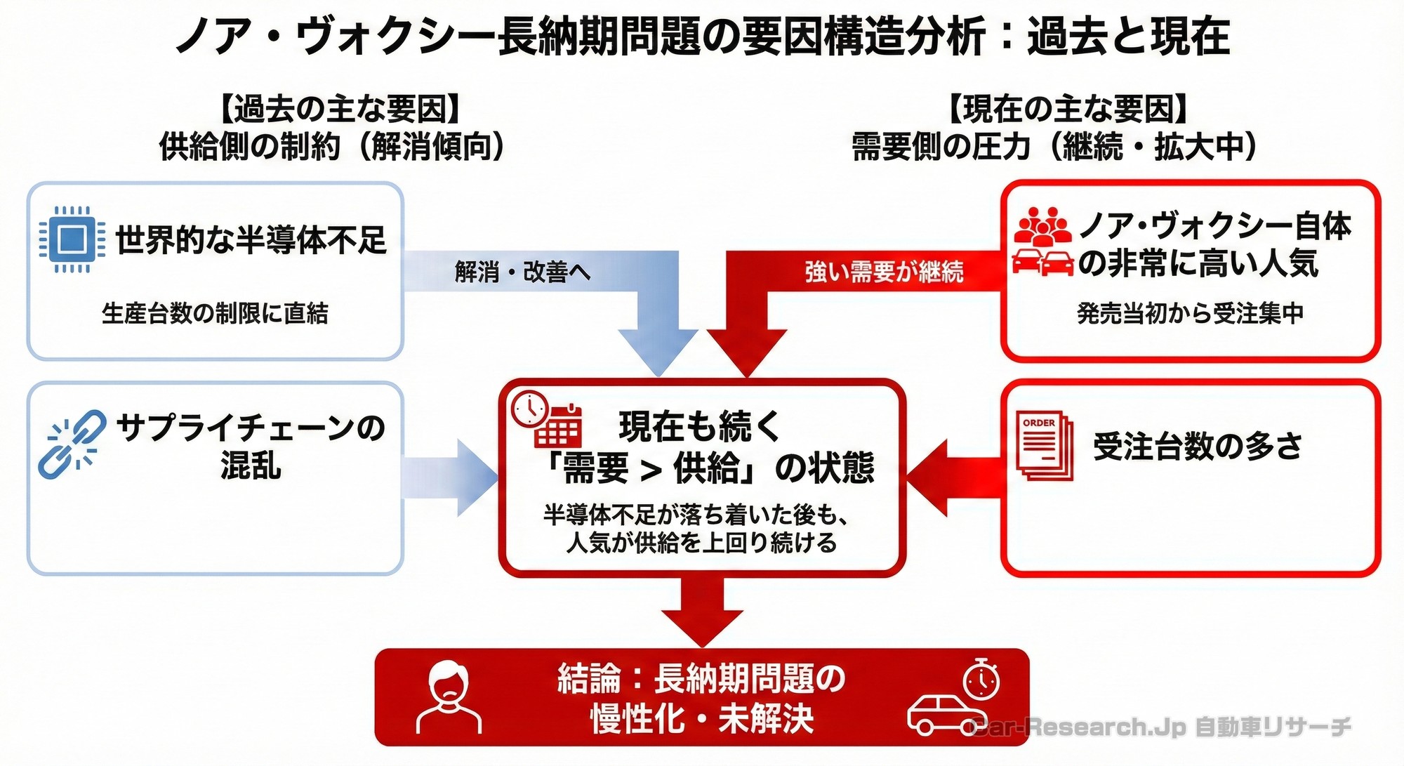 その後、一般的には半導体不足は解消に向かい、サプライチェーンも改善してきているとされています。それでもなお、フルモデルチェンジから2年ほどたった段階になっても、ノア/ヴォクシーの納期問題は完全には解消していません。つまり、半導体の問題が落ち着いてきたあとも、ノア/ヴォクシーは「需要>供給」の状態が続いているということになります。