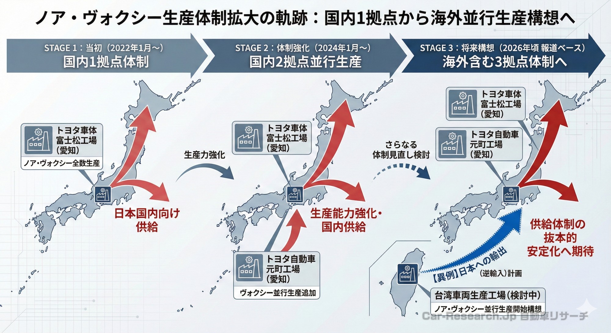 2024年9月20日付の中部経済新聞では、供給体制見直しの具体的な方向性として、台湾での並行生産構想が報じられています。報道の内容によれば、トヨタは2026年から台湾の車両生産工場で、ノアとヴォクシーの新たな生産を開始する検討に入ったとされています。
