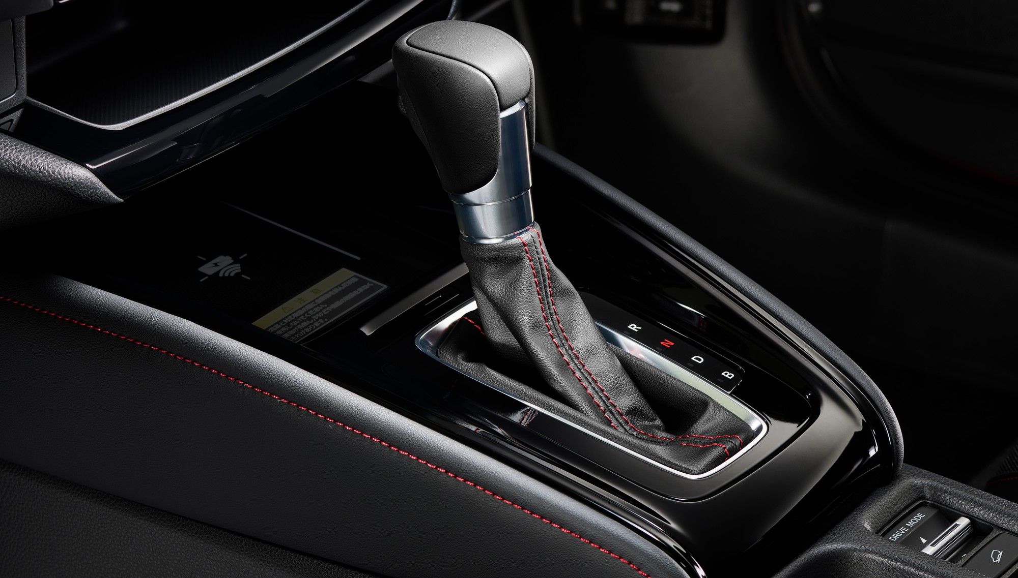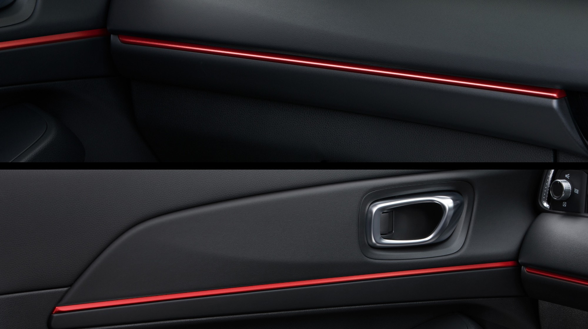 本革巻(スムースレザー)のステアリングホイール、シフトセレクトノブとシフトブーツ、ドアアームレスト、アームレスト付きセンターコンソールボックスにレッドステッチを施し、インパネガーニッシュとドアライニングガーニッシュにはレッドカラーを採用しました。