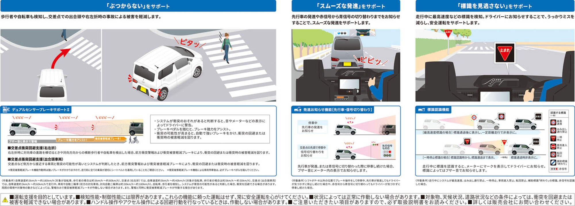 従来ワゴンRシリーズでは、スズキの予防安全技術「SUZUKI セーフティサポート」の前方に対する衝突被害軽減ブレーキとして、「デュアルセンサーブレーキサポート」が採用されてきた。マイナーチェンジによる新型からは「デュアルカメラブレーキサポート」の採用となる。